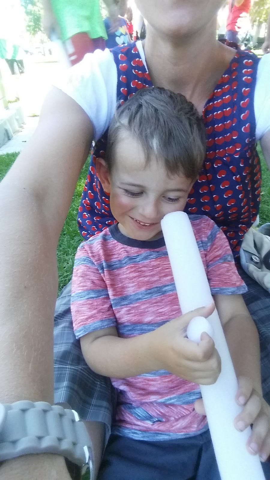Here's Engineer Max, checking out his light saber to "figure it out". He was very excited to show me the lights he found inside the styrofoam that made the light saber glow.